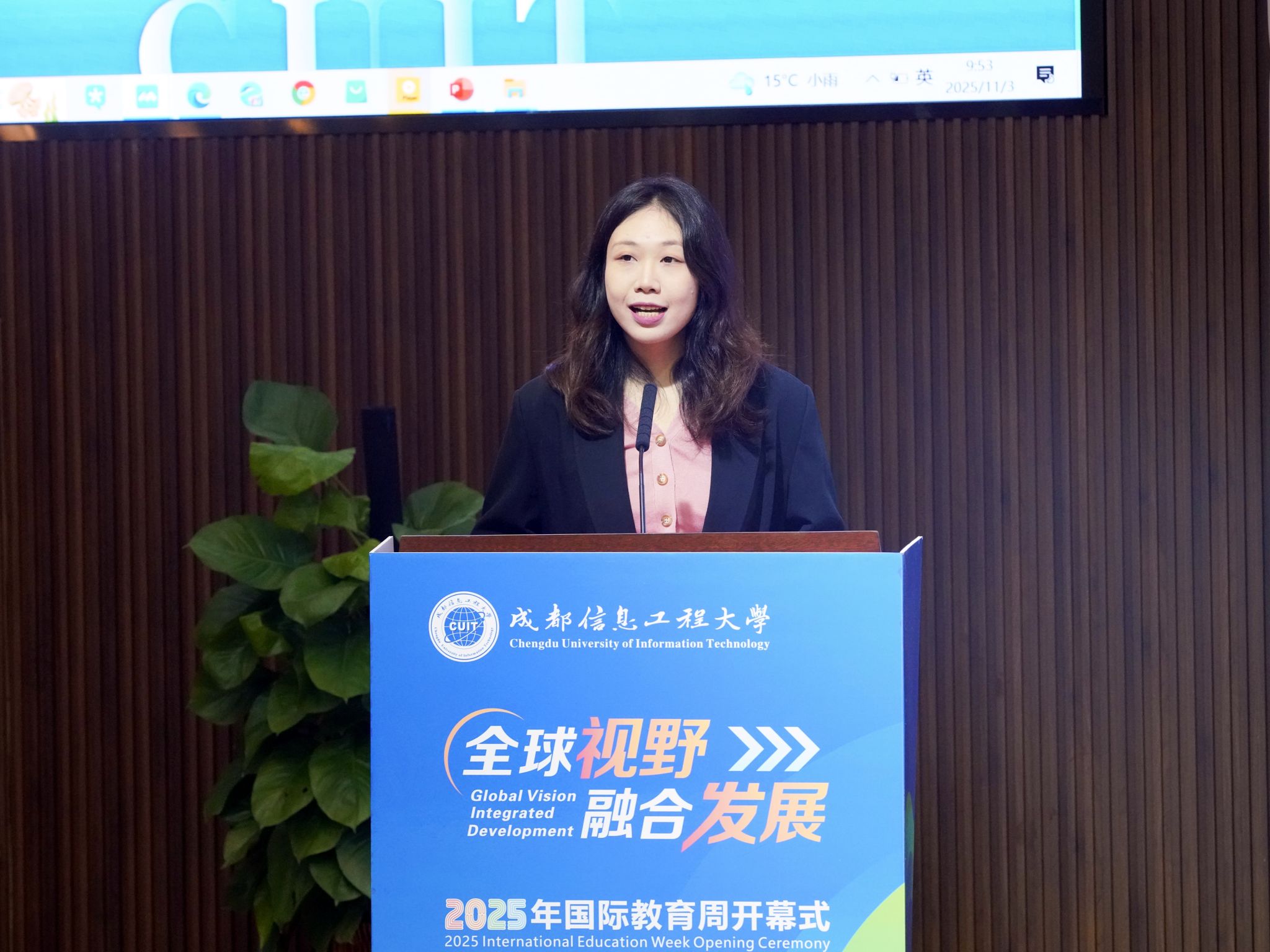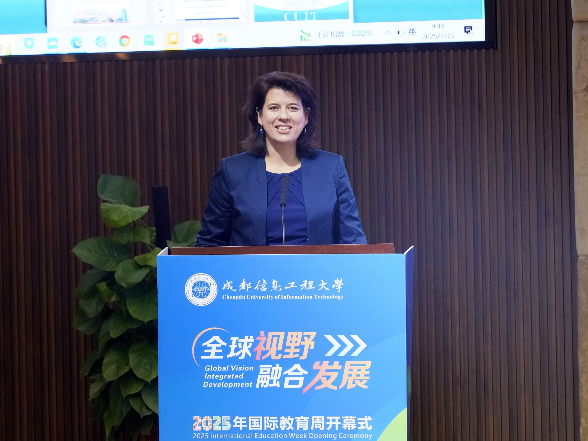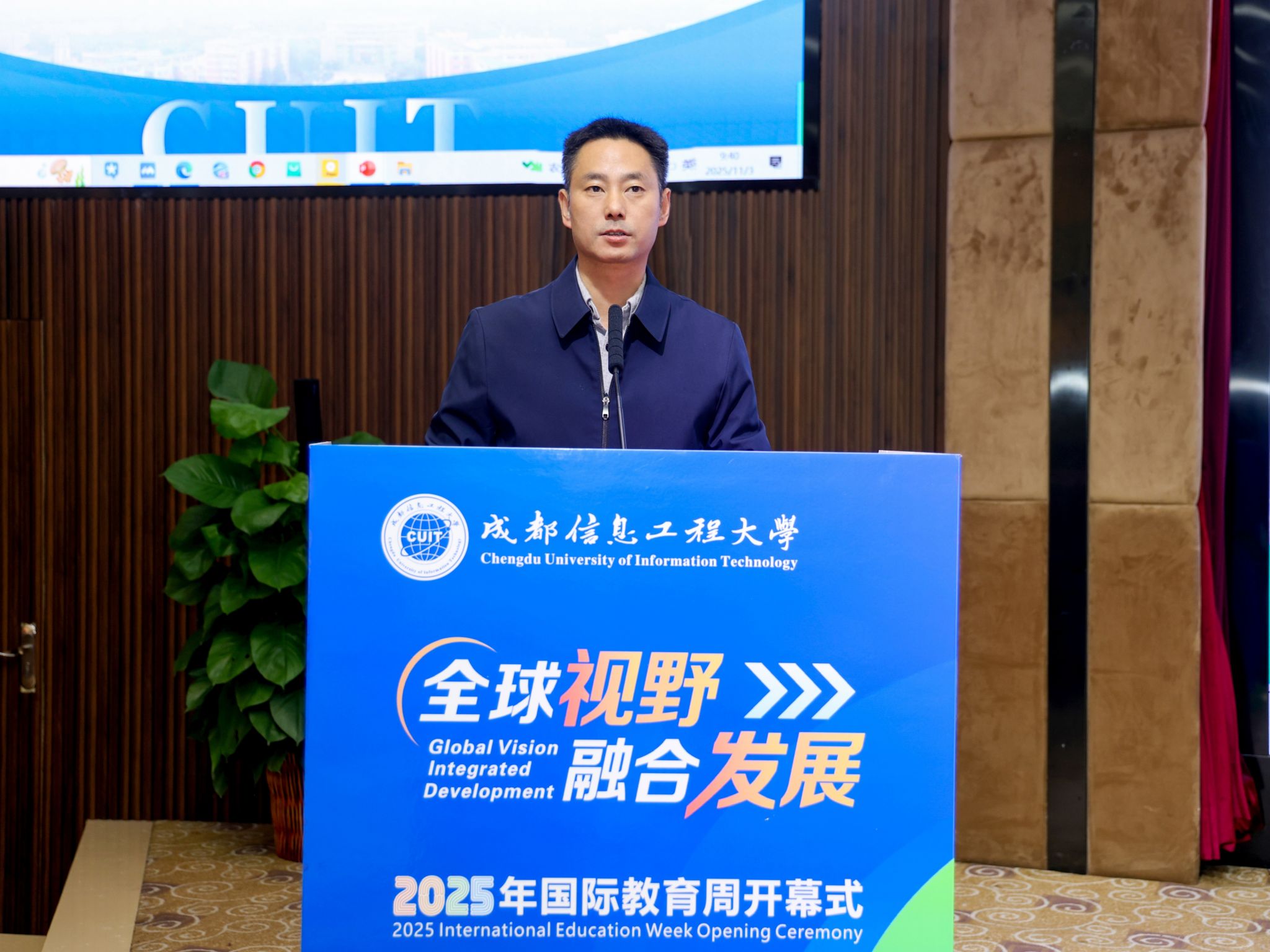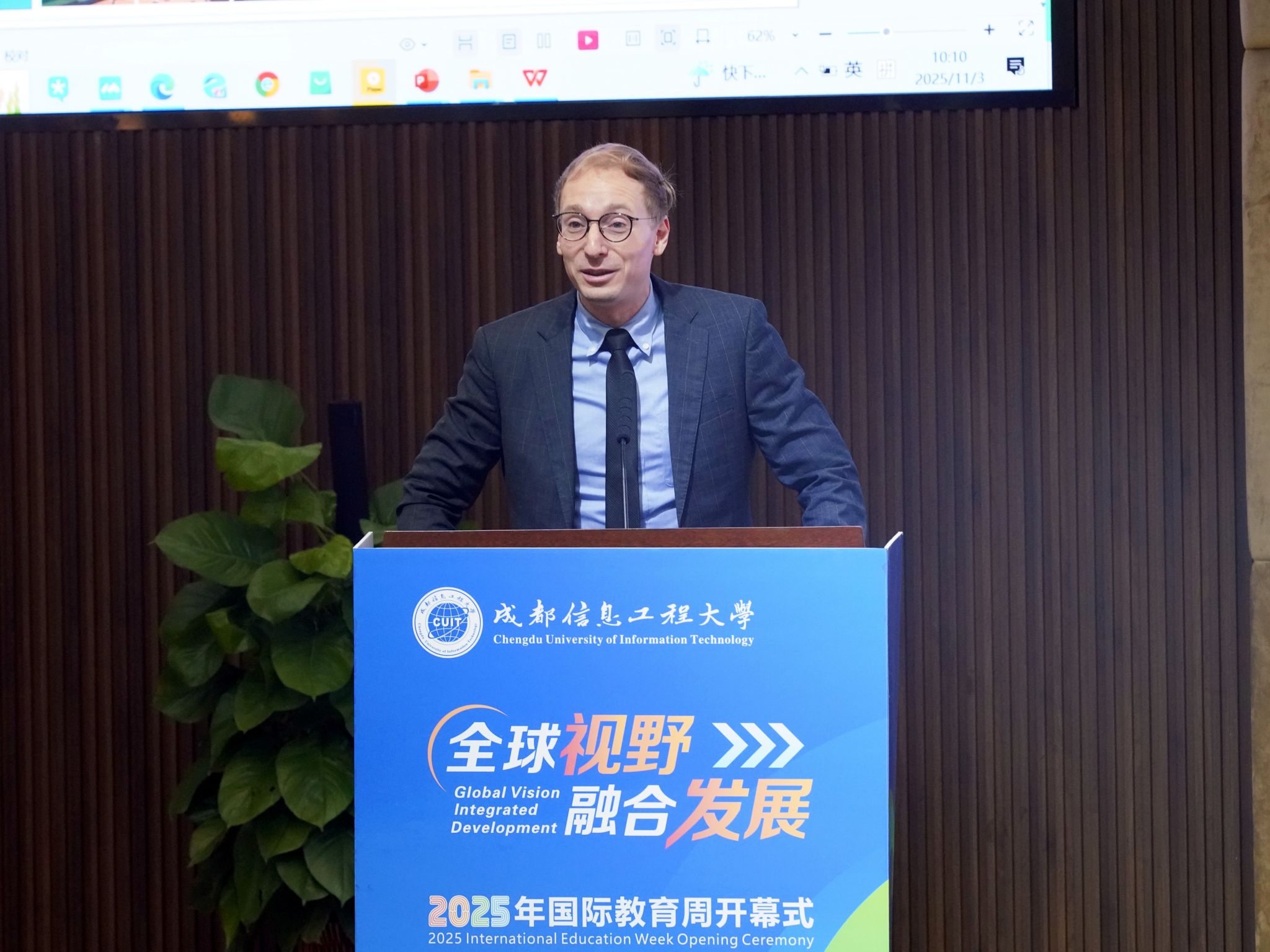 陈权亮在开幕式致辞中,对远道而来的嘉宾及师生表示热烈欢迎与衷心感谢。他强调,教育全球化背景下,唯有通过理解多元文化认识自我,借助融合发展实现更具韧性的成长。他指出,本次国际教育周以“1+N”模式为框架,活动丰富,包含法国文化体验、国际音乐会、留学服务与指导、多场高水平学术讲座,以及各学院特色国际学术活动,是营造开放融合校园生态、拓宽学生全球视野、锻炼跨文化交流能力、推动科研创新与国际接轨的重要举措。