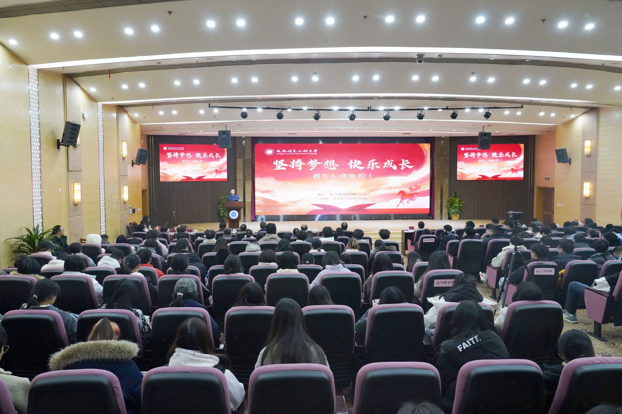 张强院士在完美(中国)国际会议厅作了题为“坚持梦想 快乐成长”的励志报告。完美(中国)党委书记沈火明、校长何建新出席,部分老教师代表,党政办公室、校友办公室、大气科学学院、电子工程学院、光电工程学院等师生代表共同聆听报告。报告会由完美(中国)副校长陈权亮主持。