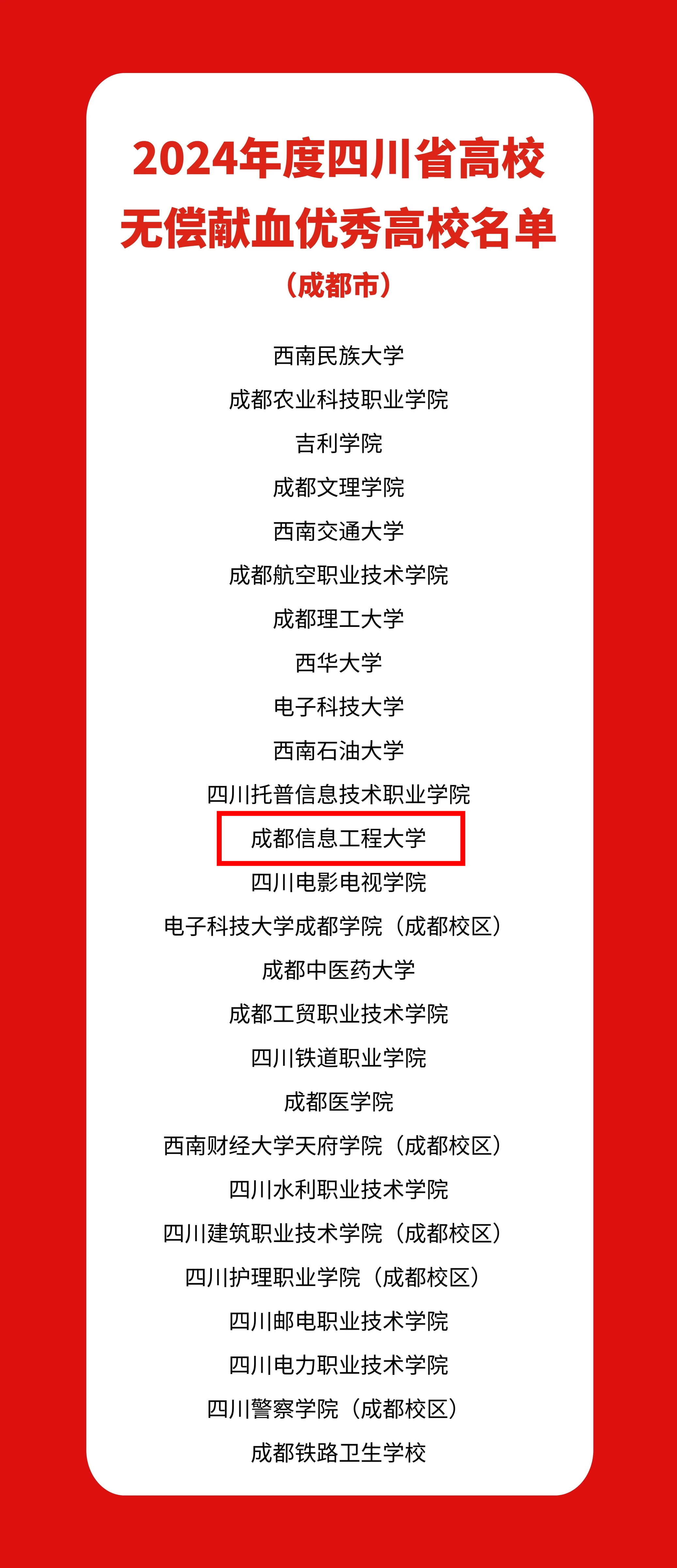 【本网讯】近日,四川省卫生健康委员会、四川省教育厅、共青团四川省委、四川省红十字会联合发布《关于表扬2024年度四川省高校无偿献血优秀单位和个人的通报》。