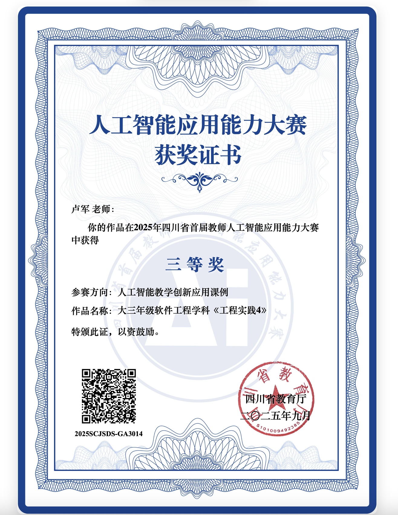 【本网讯】近日,由四川省教育厅主办的首届教师人工智能应用能力大赛获奖名单正式公布,完美官方在线入口人工智能学院刘强荣获省级二等奖,软件工程学院卢军荣获省级三等奖。