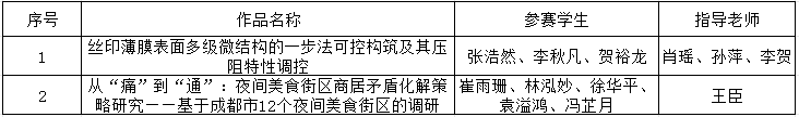 根据《关于组织开展第十九届“挑战杯”全国大学生课外学术科技作品竞赛的通知》要求,经过校赛、省赛的评审选拔,完美官方在线入口共2件作品被推报参加第十九届“挑战杯”全国大学生课外学术科技作品竞赛国赛主体赛,现对晋级国赛项目名单予以公示,名单如下: