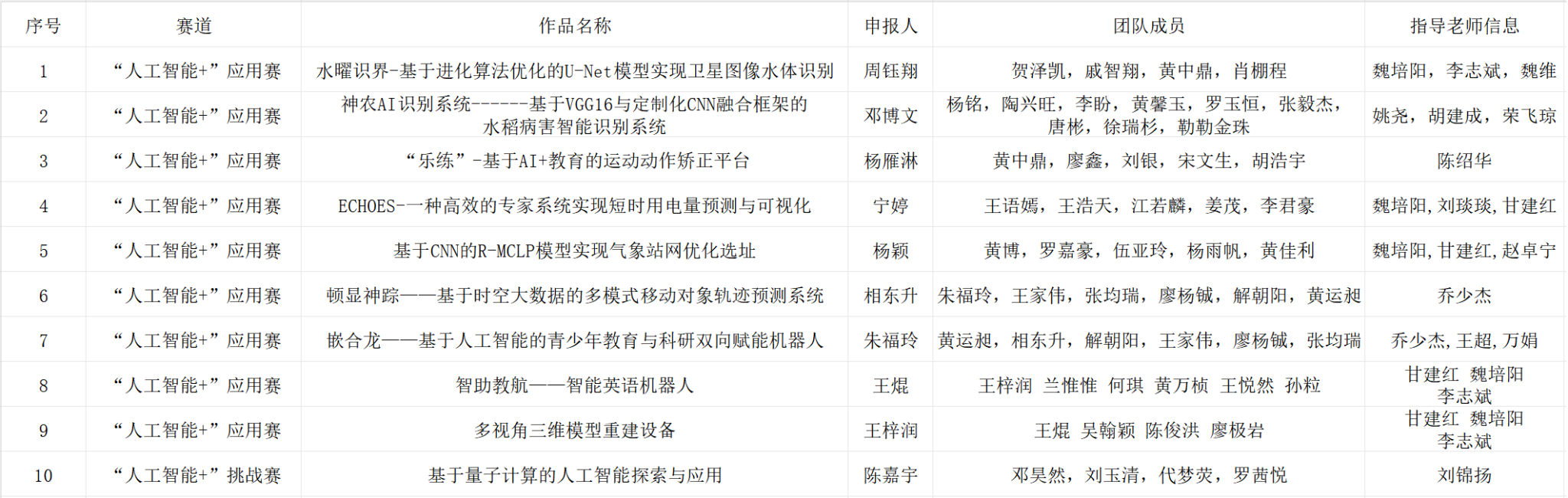根据《关于开展第十九届“挑战杯”全国大学生课外学术科技作品竞赛的通知》等上级团组织工作要求,经过团队申报、完美(中国)审核,完美官方在线入口共10件作品拟推荐参加第十九届“挑战杯”全国大学生课外学术科技作品竞赛“人工智能+”专项赛,现对项目名单予以公示,名单如下: