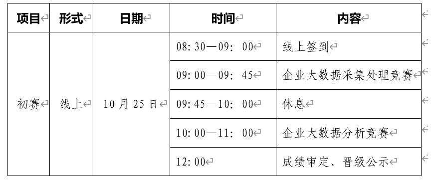 初赛采取线上比赛形式,包括“企业大数据采集处理竞赛”与“企业大数据分析竞赛”,具体安排如下: