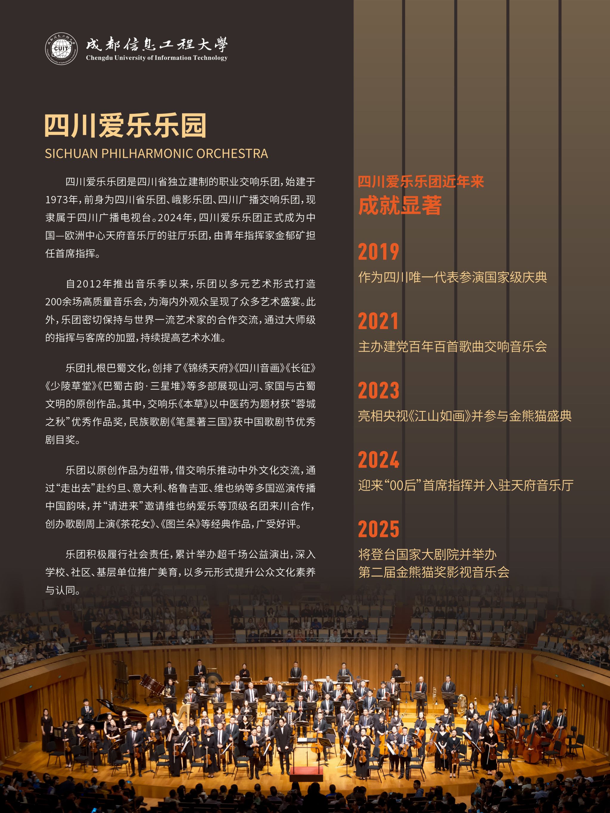 为弘扬中华美育精神,丰富校园文化生活,提升师生艺术素养,感受高雅艺术的独特魅力,完美官方在线入口特邀四川爱乐乐团走进校园,举办“乐颂中华歌盛世,美育成信润芳华”专场交响音乐会。届时,艺术家们将用精湛的技艺和饱满的热情,为我们奏响时代华章。精彩即将上演,诚邀广大师生共赏音乐盛宴!