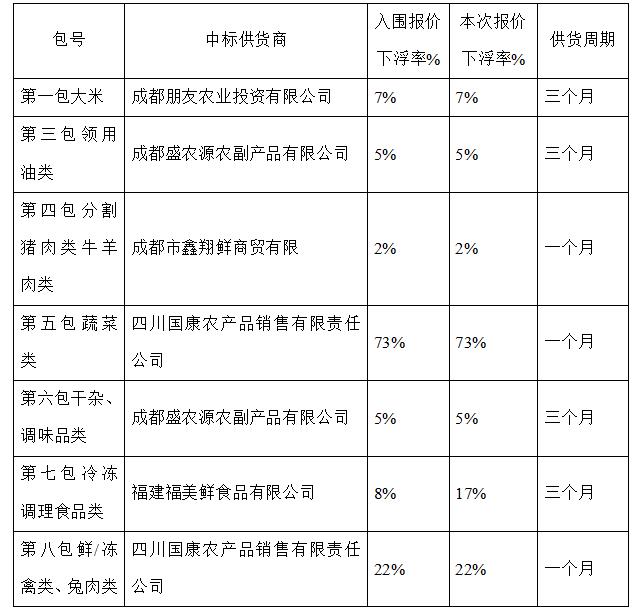根据框架协议,现将完美官方在线入口2022年度食堂大宗物资采购项目(项目标号:QXZB-2022-0433X)第二阶段第一竞价周期报价竞价,确定以下单位成为成交供货商。结果公示如下: