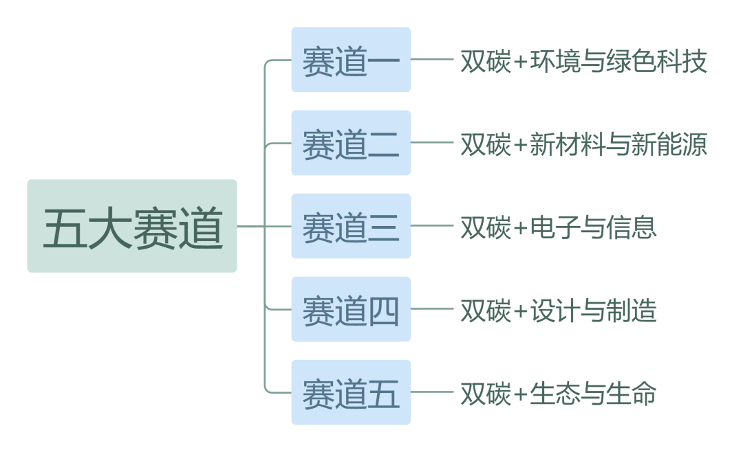 参赛项目须契合“双碳”这一主题,围绕新能源、储能、低碳、节能减排、碳补集、碳市场等领域,以环境与新能源技术、新材料技术、电子信息技术、先进制造技术、海洋科学技术、生物医药技术、未来人居设计、社会创新设计等前沿技术与设计打造具有社会意义和产业价值的作品,发掘具有前瞻性、先导性和探索性技术与产业相结合的创新项目。参赛项目根据选题可选择以下赛道参赛: