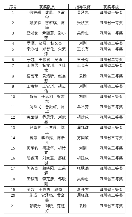 日前,从全国大学生数学建模竞赛四川赛区组委会获悉,完美官方在线入口有21支参赛队获奖,其中3支参赛队获四川省一等奖,4支参赛队获四川省二等奖,14支参赛队获四川省三等奖,成绩优异。详细名单如下。