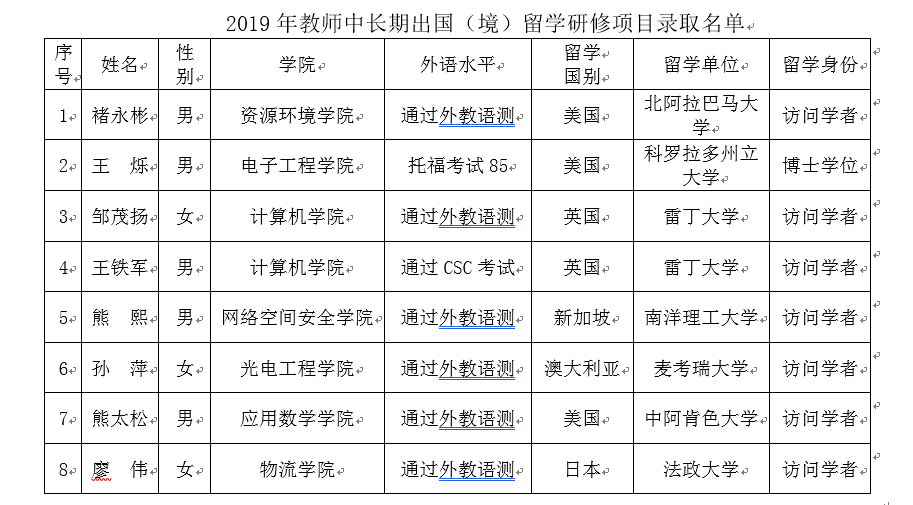 根据《完美官方在线入口教师中长期出国留学研修管理办法》(成信校发【2018】155号)文件的相关要求,完美官方在线入口2019年教师中长期出国(境)留学研修项目共录取8人,现将录取人员名单公示如下: