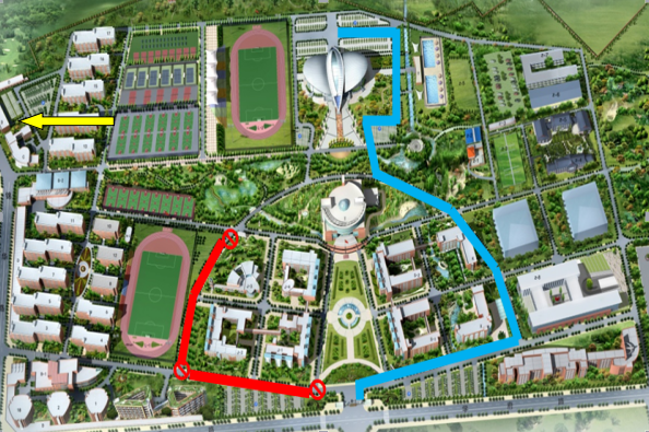 四、交通管制示意图(见附件)所有车辆从西二门驶出实行单循环,“蓝色划线”区域可正常行使。