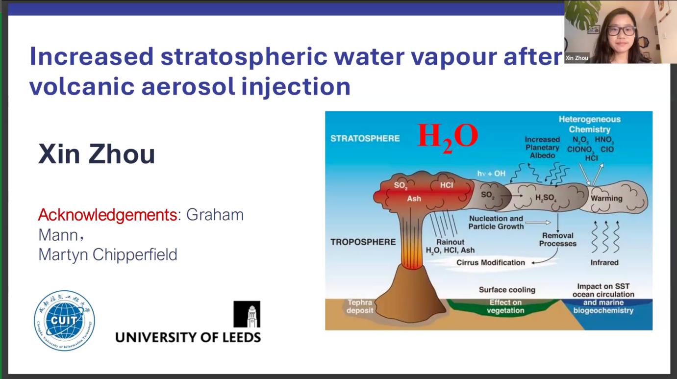 该研讨会汇集了来自英国、美国、德国、中国等多国的知名科学家,围绕平流层气溶胶注入(SAI)及其潜在气候影响展开深入讨论。周欣博士的报告介绍了火山喷发后平流层中气溶胶和水汽的传输与演变特征,揭示了Pinatubo火山喷发后平流层水汽的增加机制,并探讨了这类自然过程对未来气候工程模拟的启示。报告引起了与会专家的广泛关注和讨论。