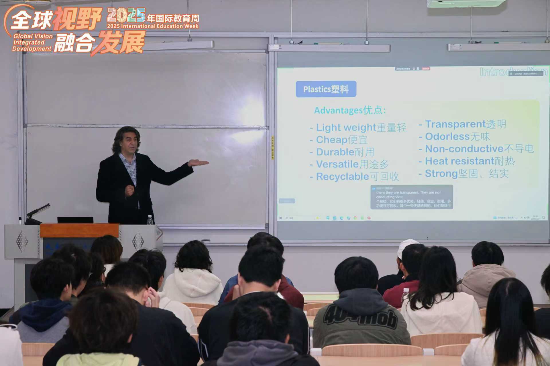 Ehsan教授从“什么是塑料”这一常见问题切入,巧妙结合眼镜、矿泉水瓶、衣物、水管等日常用品作为实例,生动阐释了多种聚合物的化学结构、特性及其广泛应用。他将复杂的材料科学知识转化为通俗易懂的语言,有效激发了同学们的求知兴趣,帮助听众对高分子材料建立起更为直观和深入的理解。