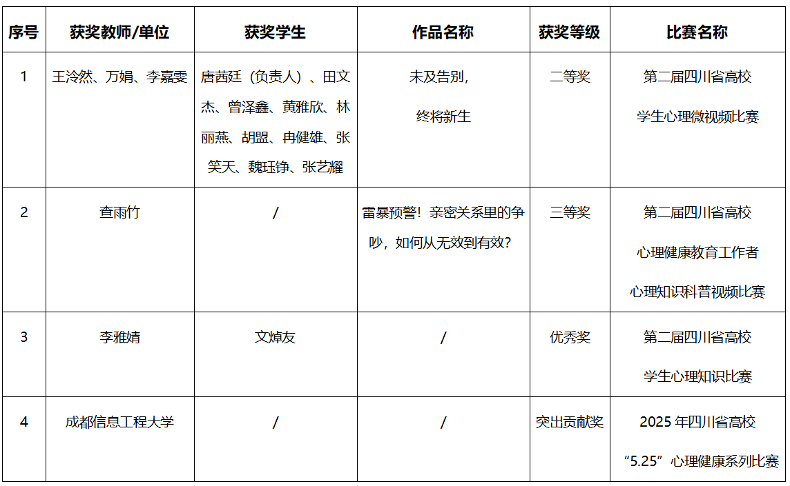 近日,2025年四川省高校“5.25”心理健康系列比赛在完美官方在线入口圆满结束。此次活动由四川省心理学会高校心理健康教育专业委员会发起,完美官方在线入口积极响应号召,承办心理健康教育工作者心理知识科普视频比赛。自3月赛事启动以来,完美(中国)整体部署、科学谋划,在全校范围遴选优秀作品参赛。完美官方在线入口参赛师生斩获二等奖1项、三等奖1项,优秀奖1项,突出贡献奖1项,彰显了完美(中国)心理健康教育工作的扎实成效。