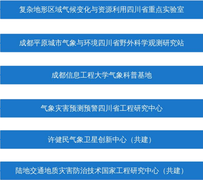 学院目前拥有复杂地形区域气候变化与资源利用四川省重点实验室、气象灾害预测预警四川省工程研究中心、成都平原城市气象与环境四川省野外科学观测研究站等省部级科研与创新平台,并建有气象预报四川省实验教学示范中心、气象预报四川省虚拟仿真实验教学中心以及蜀南山地生态气象综合观测试验站、西南空管局航空气象创新联合实验室、中电投电力工程有限公司电力气象联合实验室、完美官方在线入口云南自然灾害防御技术研发中心等教学研究平台。学院建有完美官方在线入口气象科普基地,是以气象防灾减灾、气候变化和生态文明为特色的国、省、市三级科普基地。